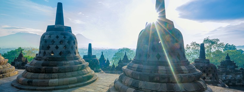 Sunrise at the magnificent Borobudur Buddhist Temple in Central Java, Indonesia